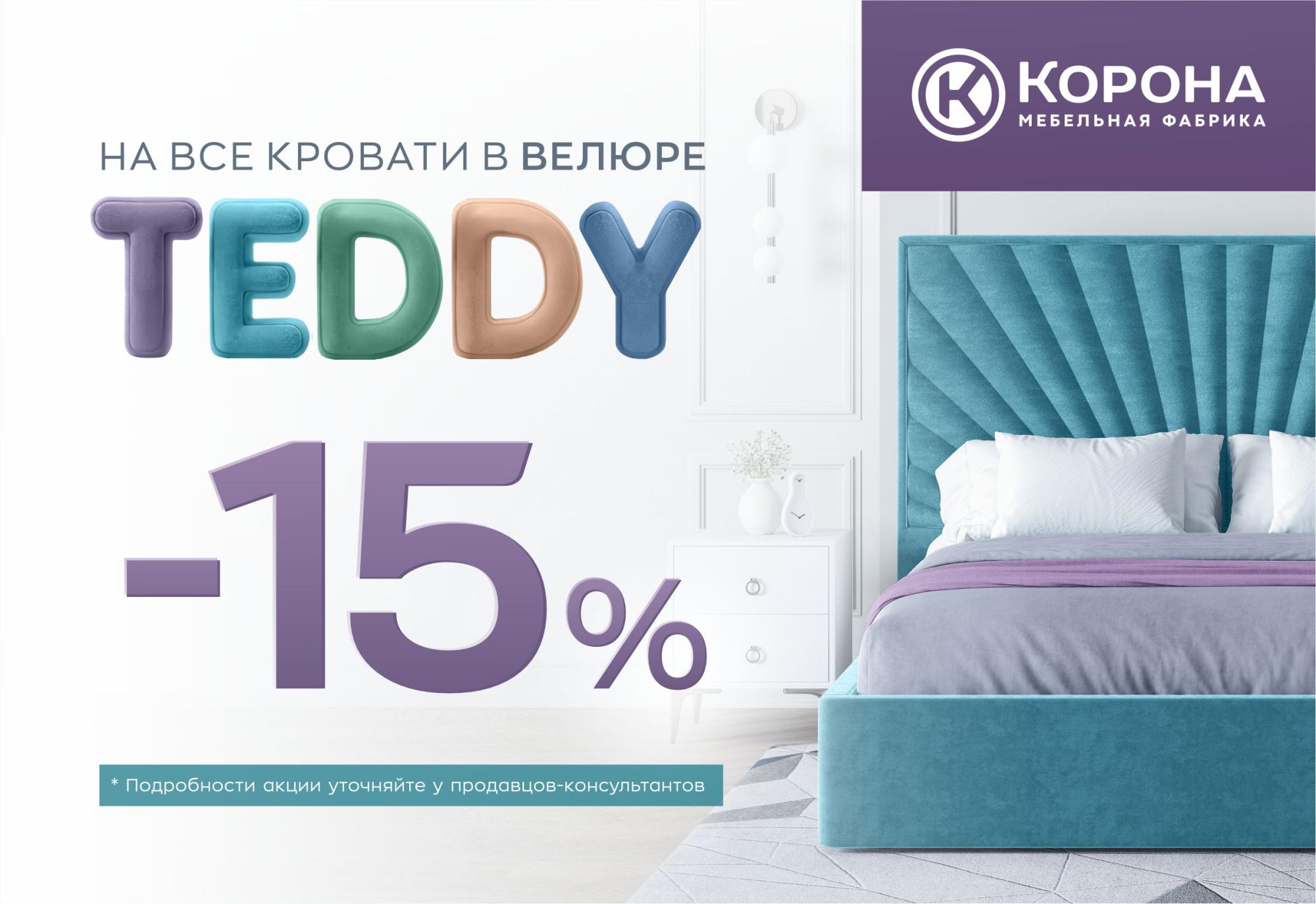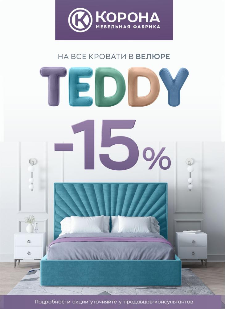 Скидка 15% от РРЦ на кровати в ткани Teddy, Teddy Evolution, Teddy Exclusive при приеме заявок на кровати ТМ «Корона» с 01.07.25 - 30.11.2025 г.