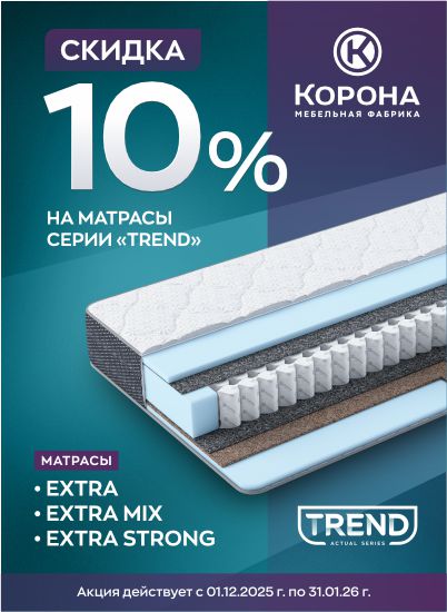 Получите скидку 10% на матрасы повышенной комфортности серии «Trend» в период с 1 декабря 2025 по 31 января 2026.